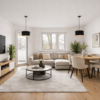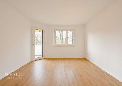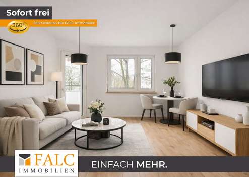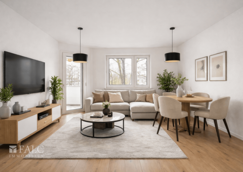 Der helle Wohn- und Essbereich bildet das Herzstück der Wohnung. Große Fenster sorgen für eine freundliche Atmosphäre, und der Balkon lädt dazu ein, den Tag mit einem Kaffee zu beginnen oder ihn entspannt ausklingen zu lassen. Die separate Küche lässt sich individuell und funktional einrichten und schafft Ordnung und Ruhe im Wohnraum – praktisch im Alltag und angenehm für Gäste.