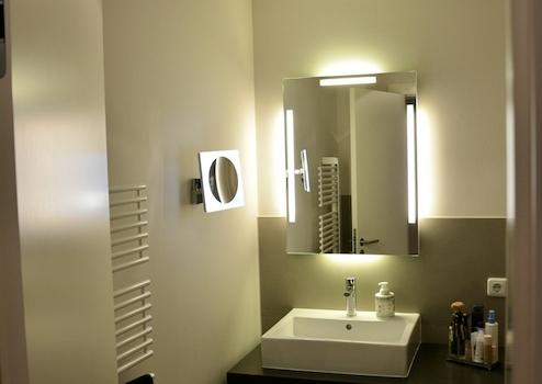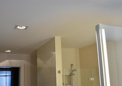 oEin luxuriös ausgestattetes Bad (Badmöbel Fogo, freistehende Spiegel, Delta Light-Leuchten)