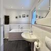 Herzstück des Hauses ist der lichtdurchflutete Wohnbereich mit bodentiefen Fenstern und einem gemütlichen Kamin für kalte Winterabende. Die offene Einbauküche ist mit hochwertigen E-Geräten ausgestattet und geht fließend in den Essbereich über. Für maximalen Komfort sorgen die Fußbodenheizung, sowie eine Klimaanlage im gesamten Haus. Das Badezimmer überzeugt sowohl mit einer Badewanne als auch mit einer barrierefreien Dusche.