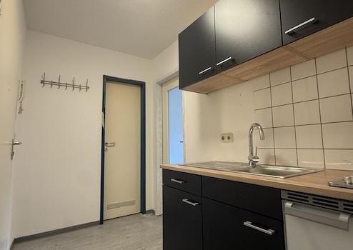 Die bauliche Trennung zwischen Wohn- und Schlafbereich verleiht der Ein-Zimmer-Wohnung einen attraktiven Zwei-Zimmer-Charakter und sorgt für eine klare, angenehme Raumstruktur. Die weiß gehaltenen Wände schaffen eine helle, zeitlose Wohnatmosphäre. Ein besonderes Highlight der Wohnung ist die neue Einbauküche, die sich modern und funktional in den Wohnbereich einfügt.