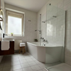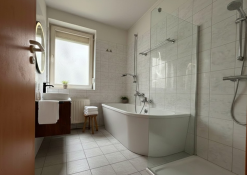 Stilvolles Badezimmer mit Badewanne, Handtuchheizkörper und Anschluss für eine Waschmaschine