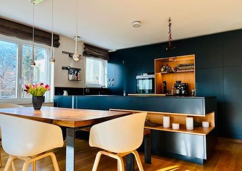 Die luxuriöse Ausstattung lässt keine Wünsche offen: edle Materialien, fein abgestimmte Oberflächen, maßgefertigte Einbauten sowie moderner Haustechnik sorgen für ein Wohngefühl auf höchstem Niveau. Der stilvolle Wohn- und Essbereich bildet das Herzstück der Wohnung und bietet ideale Voraussetzungen für repräsentatives Wohnen ebenso wie für private Rückzugsmomente.