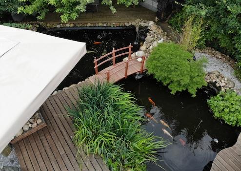 Der angrenzende Wintergarten eröffnet einen wunderbaren Blick in den neu gestalteten Garten mit Koiteich und schafft ganzjährig eine Verbindung zur Natur.