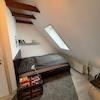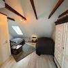 Über eine massive Holztreppe gelangt man in den abgeschlossenen oberen Bereich, in dem sich ein großzügiges Schlafzimmer mit dekorativen Holzbalken befindet. Ein weiteres Plus ist ein separates WC auf dieser Ebene.
