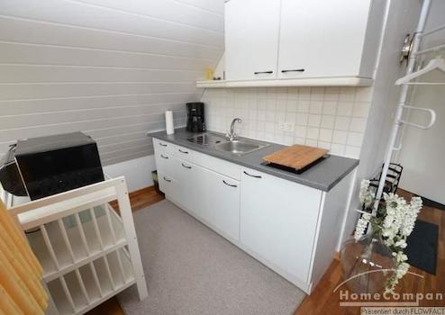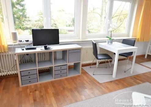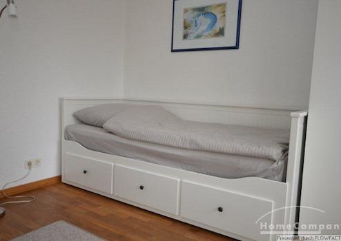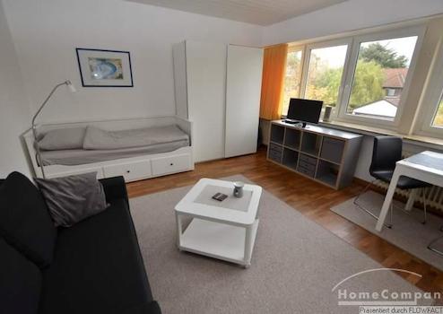 Diese ruhige Apartment liegt im Dachgeschoß eines Einfamilienhauses. Durch geschickte Platzierung der Möbel besteht ein Wohn- und Schlafbereich mit einem Tagesbett sowie ein großzügiger Essbereich. Etwas abgeteilt in einer Nische findet sich die Singleküche mit Herd und Mikrowelle. das badezimmer is mit einer Dusche ausgestattet. Vom Flur aus kommt man zum Balkon. Die Im Keller befindliche Waschmaschine kann mit genutzt werden.