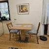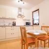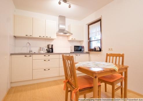 Einbauküche, Backofen, Ceranckochfeld, Dunstabzugshaube, Kühlschrank mit Gefrierfach, Mikrowelle, Wasserkocher, Kaffeemaschine, Töpfe, Pfannen, Geschirr und alles für den täglichen Bedarf, Holztisch mit 2 Stühlen