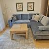 Sofa, kleiner Holztrisch, Flach-TV mit Holzunterstelltisch,