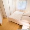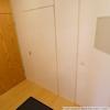 Kleiderschrank mit Türen, Bettdecken und Kissen.