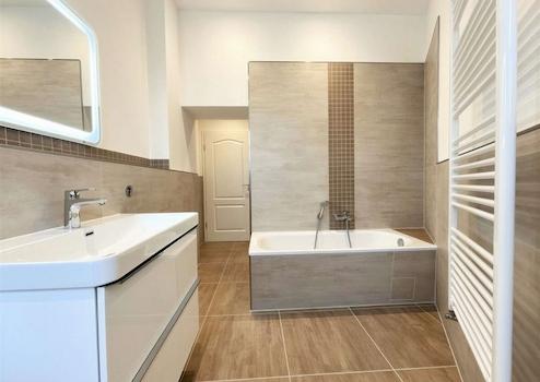 - Ein modernes Badezimmermit Dusche und Badewanne