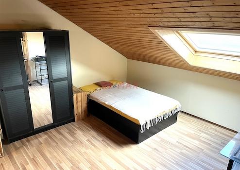 Das Dachgeschoss ist ausgebaut. Hier liegt ein großes Zimmer sowie ein kleines Tageslicht-Duschbad und ein weiteres kleines Zimmer.
