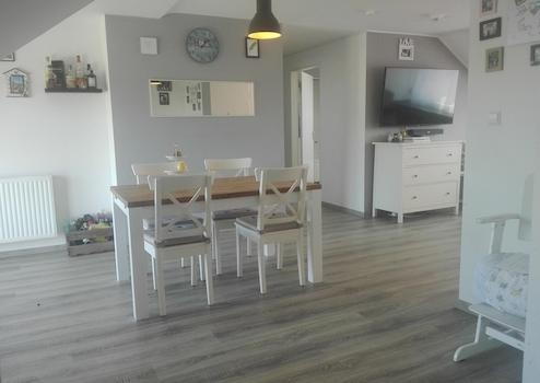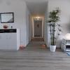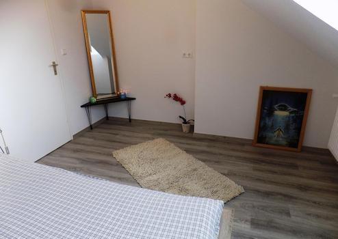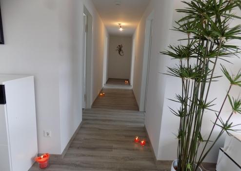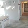 Alle Räume der Wohnung sind mit hellgrauem hochwertigem Laminat ausgelegt, nur das Bad und der Küchenbereich mit anthrazitfarbenen Fliesen.
