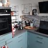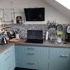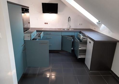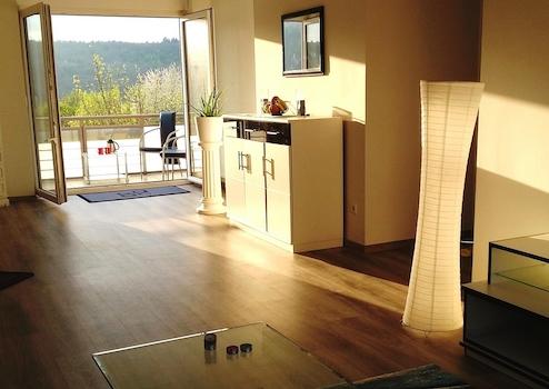 Beeindruckend geräumig präsentiert sich beim Eingang in die Wohnung der sonnendurchflutete Wohn-Essbereich mit dem Flur zu den drei weiteren Zimmern und dem Bad. Der Blick nach links führt zum großen modernen überdachten West-Balkon mit dem weiten Blick über die schöne waldige Landschaft. Dieser Balkon wurde durch Milchglas-Seitenlaibungen aufgewertet, so dass Sie zum Einen mehr Privatsphäre haben und zum Anderen kaum Regen und Wind eindringen kann. (Diese Erweiterung ist erst neu hinzugebaut worden und daher noch nicht auf den Fotos zu sehen.) Weiter links blickt man zum offenen Küchenbereich. Die 4 Jahre junge, auf Maß eingepasste hochwertige Einbauküche (Herd mit Ceranfeld, Dunstabzug, Backofen auf Brusthöhe, Kühlschrank mit separaten Gefrierfächern) kann von Ihnen zum Preis von 2.900€ erworben werden. Auf den Fotos sehen Sie teilweise noch die alte Küche, die nur eine Küchenzeile war. Die Neue ist graublau in U-Form und natürlich auch auf den Fotos zu sehen.