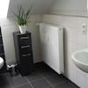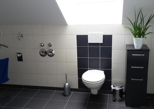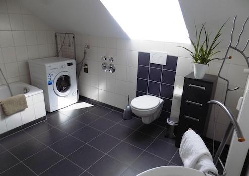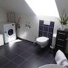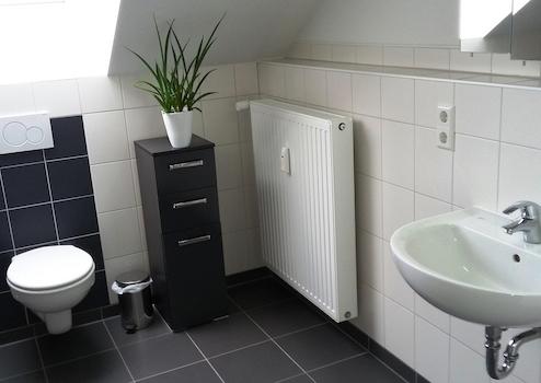 Das sehr geräumige Tageslicht-Bad ist ausgestattet mit anthrazitfarbenen Fliesen, Waschbecken, Toilette und einer Badewanne, die auch zum Duschen genutzt werden kann. Hier sind auch Anschlüsse für Waschmaschine und Trockner vorhanden, falls Sie diese nicht im hauseigenen Gemeinschafts-Wäschekeller unterbringen möchten, in dem extra für jede Wohneinheit ebenfalls Platz für diese Geräte vorgesehen ist.