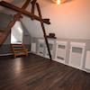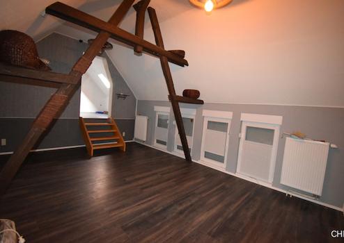 Über die massive Holztreppe gelangen wir nun in das ausgebaute Dachgeschoss. Vom geräumigen Dielenbereich hat man Zugang zu einem grossen Schlafzimmer mit eigenem Ankleidebereich und einem Kinder- / oder Gästezimmer. Der Spitzboden ist über eine Einschubtreppe in der Diele zu Erreichen und bietet Stauraum für Dies und Das.
