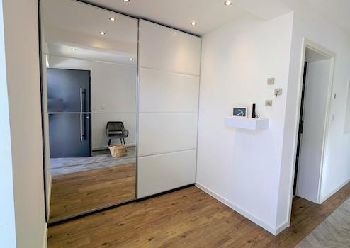 Über eine große, halbüberdachte Terrasse betreten Sie den Hauseingangsbereich über die Sicherheitstür und befinden sich in der Diele mit Einbau-Garderobe.