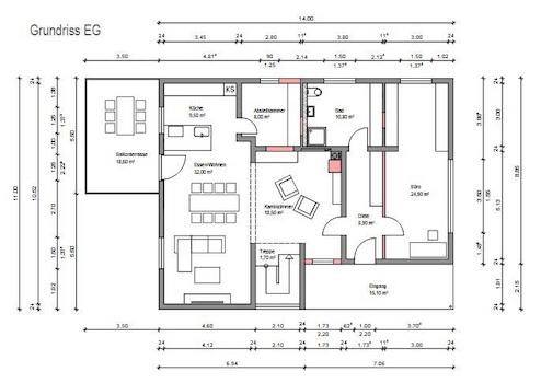 Im EG befindet sich ein großes Büro, das Kaminzimmer und ein offener Wohn-Ess-Küchenbereich und Vorratskammer.