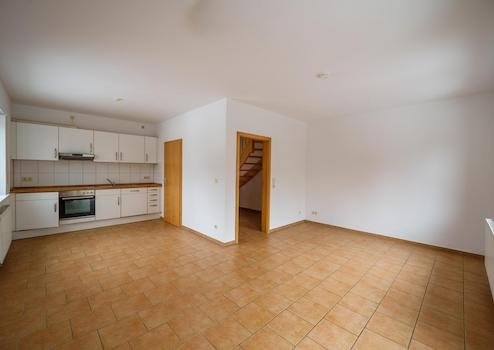 Der offene Wohn-Essbereich mit integrierter Küche bildet den zentralen Wohnbereich des Hauses. Eine Einbauküche ist vorhanden. Zusätzlich steht im Erdgeschoss ein separates Gäste-WC zur Verfügung. Das Badezimmer im Dachgeschoss ist mit Dusche und Tageslicht ausgestattet.