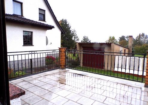 Die erhöhte Terrasse ist direkt vom Wohnzimmer erreichbar und erweitert den Wohnbereich angenehm nach draußen.