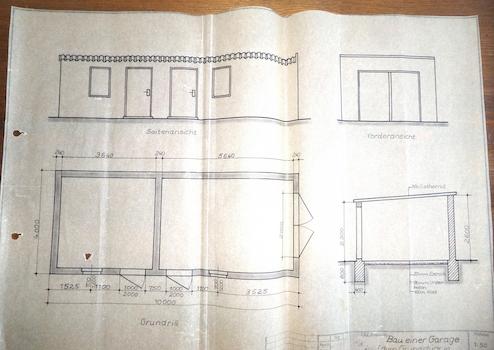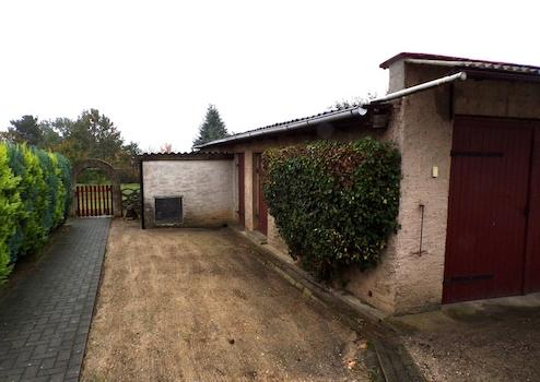 Nebengebäude rechts: Garage, zusätzliche Lagerräume, Zwingerbereich (aktuell Mülltonnenplatz), weiterer Lagerraum.