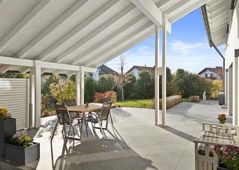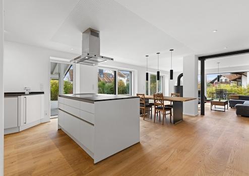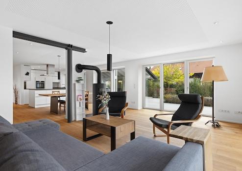 Die Südwestausrichtung des offenen Wohn-Essbereichs mit Kaminofen, umlaufend barrierefreier Terrasse, offenem belichteten Treppenhaus und eigener Sauna im Wellnessbad bieten Erholung im eigenen zu Hause.