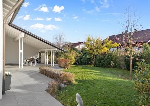 Der vorderseitige Garten lädt zum Verweilen an. Der rückseitige Garten mit blickgeschützter Pergola und Abendsonne & Geräteschuppen bietet viel Platz zum ungestörten Spielen.