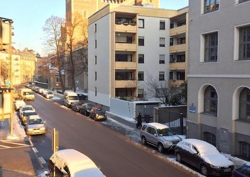Meist sehr gute Parkmöglichkeiten an der St. Maximilian Kirche, direkt vor der Haustüre.