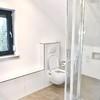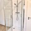 Zusätzlich steht ein schönes Schlafzimmer und ein freundliches Tageslichtbad mit Glasdusche und Regenwasserbrause , ansprechenden Mattweißen + Naturstein Fliesen , Badmöbeln und Anschluss für die Waschmaschine und Trockner zur Verfügung.