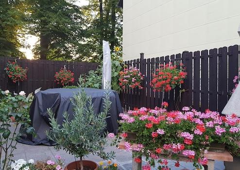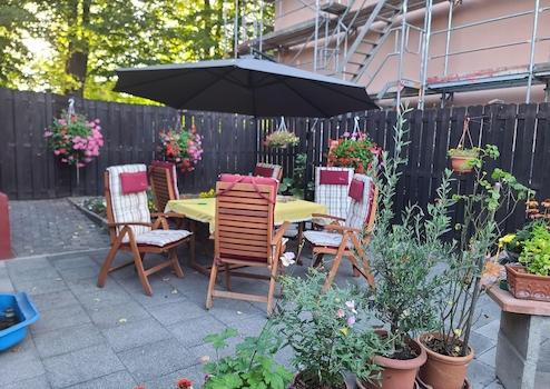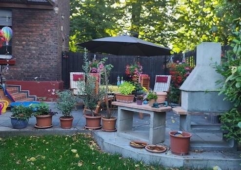 Direkt am Haus befindet sich ein Innenhof, der zurzeit als Gartenecke mit Sitzgruppe genutzt wird (Sommert. Der Gartenbereich ist zum großen Teil mit einer Holzpallisade umfriedet, sodass man auch im freien einen ruhigen zum Teil nicht einsehbaren Bereich nutzen kann (siehe Bilder)