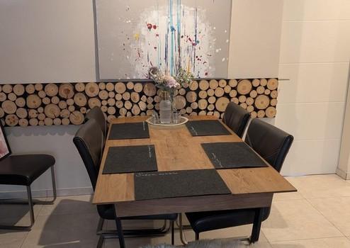 Im Ess- und Wohnbereich treffen hochwertige Fliesen und Steinwandgestaltung auf stilvolle Deckenspots, die für eine warme, stimmungsvolle Beleuchtung sorgen. Hier entstehen besondere Abende mit Familie und Freunden.