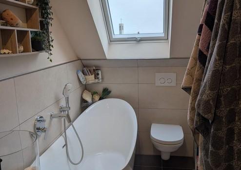 Das Badezimmer ist eine kleine Wellness-Oase: edle Fliesen und eine freistehende Badewanne sowie ein integriertes Radio laden zum Entspannen und Abschalten ein – Ihr persönlicher Spa-Moment nach einem langen Tag.