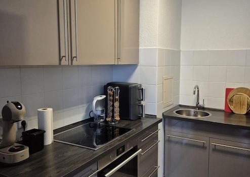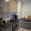 Zur Wohnung gehört eine neuwertige Einbauküche mit Elektrogeräten und Anschluss für einen Geschirrspüler.