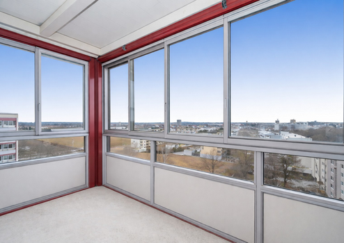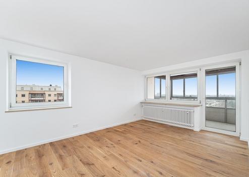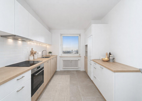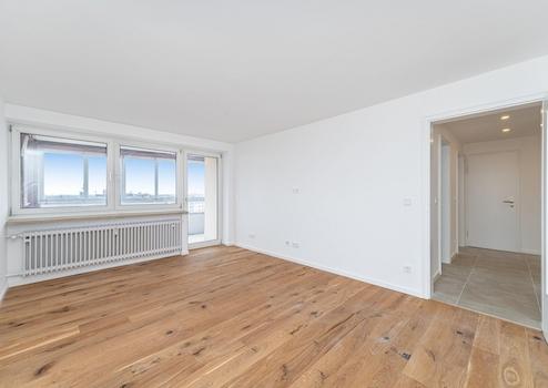 Die hochwertig sanierte 3-Zimmer-Wohnung befindet sich in einer gepflegten Wohnanlage im 8. Obergeschoss – der obersten Etage des Gebäudes – und überzeugt durch ihre ruhige Lage sowie einen schönen Ausblick. Der aufwendig modernisierte, verglaste Balkon ist direkt vom Wohnzimmer aus zugänglich und erweitert den Wohnbereich auf angenehme Weise. Dank der durchdachten Grundrissgestaltung sind sämtliche Räume bequem über den zentralen Flur erreichbar. Zur Wohnung gehören zudem ein Kellerabteil sowie ein Speicher, die zusätzlichen praktischen Stauraum bieten. Die Wohnanlage selbst ist in eine großzügige, gepflegte Grünanlage eingebettet und bietet ein angenehmes Wohnumfeld.