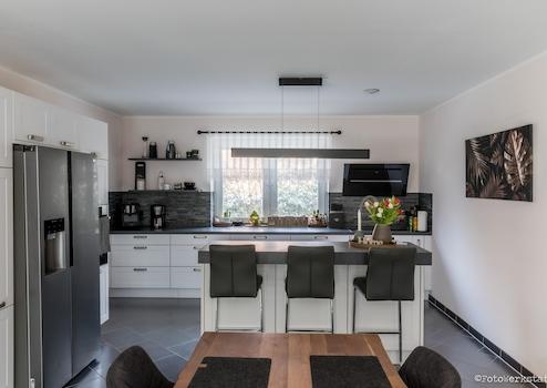 Im Erdgeschoss bildet der ca. 50 m² große Wohn- und Essbereich das zentrale Element des Hauses. Die offene Küche ist mit einer modernen Einbauküche inklusive Side-by-Side-Kühlschrank, Kochinsel und Tresen ausgestattet und fügt sich harmonisch in den Raum ein. Von hier aus besteht ein direkter Zugang zur Terrasse und in den Garten. Ergänzt wird das Raumangebot im Erdgeschoss durch einen praktischen Hauswirtschaftsraum sowie ein Schlafzimmer mit En-Suite-Bad, das über eine ebenerdige Dusche und eine Badewanne verfügt. Ein weiteres Tageslichtbad mit ebenerdiger Dusche steht ebenfalls auf dieser Ebene zur Verfügung.