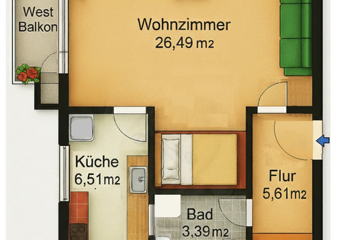Die Küche verfügt über eine moderne Einbauküche. Der Wohnraum ist lichtdurchflutet und freundlich gestaltet. Der Schlafbereich befindet sich in einer gemütlichen Bettnische. Das moderne Badezimmer ist mit einer Dusche sowie einer neuen Waschmaschine ausgestattet. Im Wohnbereich ist Laminatboden verlegt.