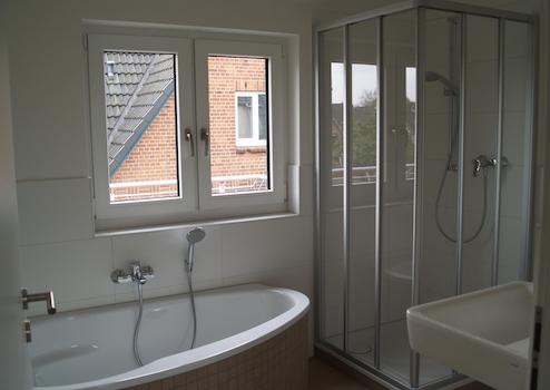 Die Ausstattung zeigt sich in einem gepflegten Zustand. Die Fußböden sind mit Design- Planken, die Nassbereiche mit Fliesen ausgelegt. Das Vollbad mit Fenster ist mit hellen Fliesen und weißem Sanitär ausgestattet. Ein weiteres WC ist im Erdgeschoss vorhanden. Die Küche ist mit einer hellen Einbauküche mit elektrischen Geräten voll ausgestattet. Die regelmäßige Garten-/ Grundstückspflege werden durch die Mieter gewährleistet.