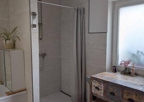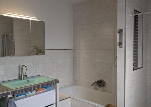 - Hauptbad im Erdgeschoss mit Badewanne und Dusche, geflieste Wände