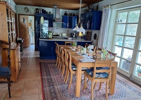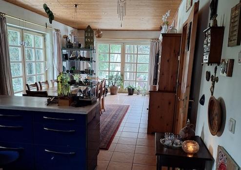 Kamin in den kälteren Monaten eine angenehme Atmosphäre schafft. Die Einbauküche ist unmittelbar an