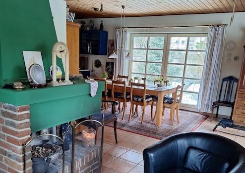 Terrasse und in den Garten. Bodentiefe Fenster sorgen für viel Tageslicht, während ein holzbefeuerter