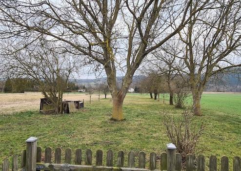 Vor und hinter dem Haus befinden sich große Streuobstwiesen.
