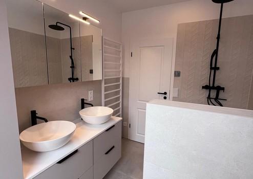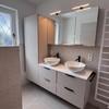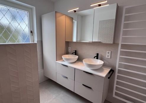 - Tageslichtbad im Erdgeschoss mit ebenerdiger Dusche, Fussbodenheizung, Hochschrank und Spiegelschrank