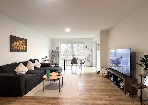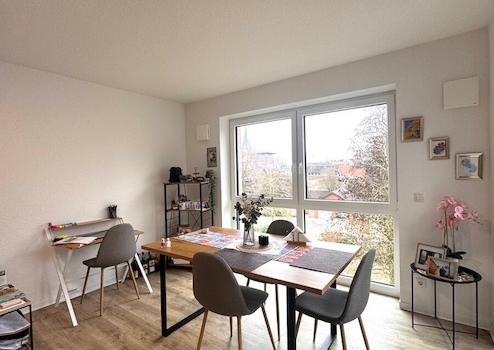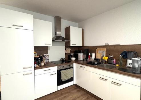 Der helle Wohn- und Essbereich präsentiert sich offen und bildet den Mittelpunkt der Wohnung. Die bereits vorhandene hochwertige Einbauküche ist im Mietpreis inbegriffen. Angrenzend befindet sich ein ruhig ausgerichteter Balkon, der einen angenehmen Rückzugsort im Freien schafft.