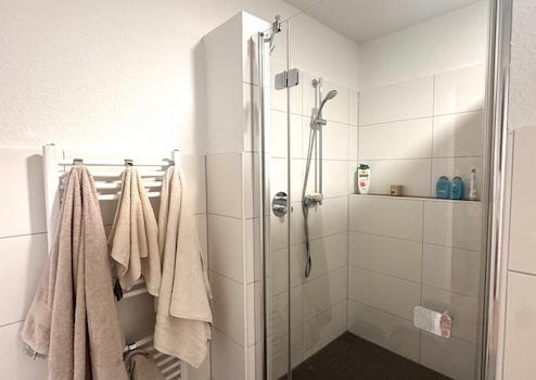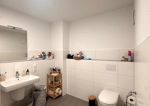 Das Schlafzimmer überzeugt durch eine angenehme Größe und eine ruhige Atmosphäre. Ergänzt wird das Raumangebot durch ein modern gestaltetes Badezimmer mit ebenerdiger Dusche sowie einen Hauswirtschaftsraum mit Anschlüssen für Waschmaschine und Trockner.