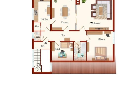 Im Erdgeschoss erwartet Sie eine Wohnfläche von ca. 117 m². Beim Betreten des Hauses gelangen Sie durch den Flur zur linken in das Gäste-WC, gefolgt von einer einladenden Küche mit praktischem Abstellraum. Der großzügige Wohn- und Essbereich bietet Zugang zur Terrasse und dem liebevoll gestalteten Garten, der mit einem erfrischenden Außenpool zum Entspannen einlädt. Zwei Schlafzimmer und das Badezimmer mit Wanne und Dusche runden die Wohnung ab.