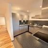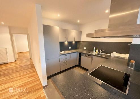 Die moderne Einbauküche fügt sich harmonisch in den Raum ein und gehört zur Wohnung.