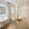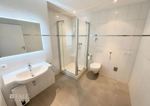 Geradeaus gelangen Sie in das modern gestaltete Badezimmer, das mit Dusche, Waschbecken, WC, Handtuchheizkörper sowie Stellflächen und Anschlüsse für Waschmaschine und Trockner überzeugt. Die zeitgemäße Ausstattung sorgt für hohen Alltagskomfort.