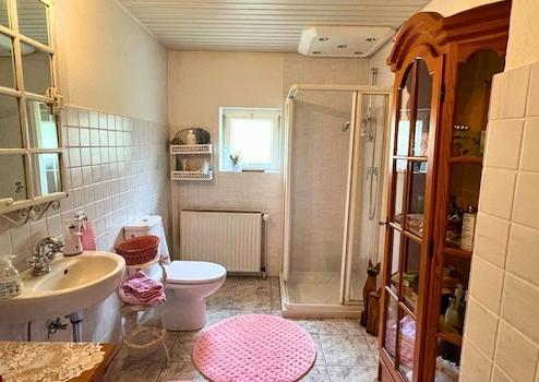 - Badezimmer aus den 1990er Jahren mit Dusche, WC und Waschbecken