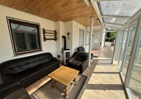 Im Erdgeschoss befinden sich drei weitere Zimmer, von denen eines als Küche nutzbar ist, sowie ein Tageslichtbad mit Dusche und Waschmaschinenanschluss. Ein besonderes Highlight ist der helle Wintergarten mit Südausrichtung, der mit einem Kaminofen beheizt werden kann. Von hier aus gelangen Sie direkt auf die Terrasse und in den mit pflegleichten Rasenflächen angelegten Garten.
