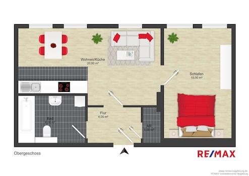 Der helle Wohn- und Essbereich mit offener Küche bildet den zentralen Mittelpunkt und bietet ausreichend Platz für Wohnen und Essen in moderner Atmosphäre. Ein gut geschnittenes Schlafzimmer, ein Badezimmer mit Badewanne sowie ein zusätzlicher Abstellraum runden das Angebot ab und sorgen für angenehmen Wohnkomfort.