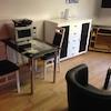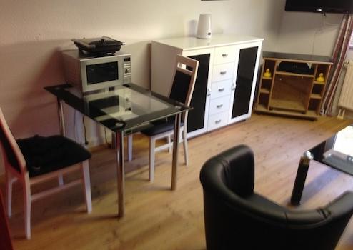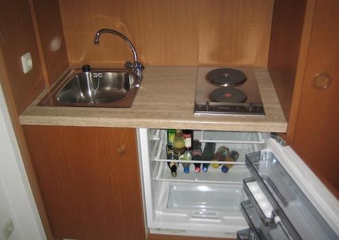 Pantry-Küchenkombination mit 2 Herdplatten, Kühlschrank, Ober- und Unterschrank und Spüle. Kleiderschrank, Schreibtisch, Gardinen, Flachbildschirm u.v.m..