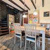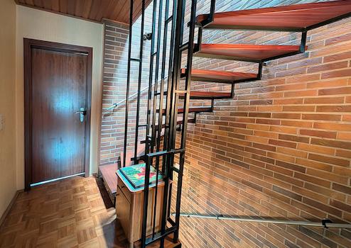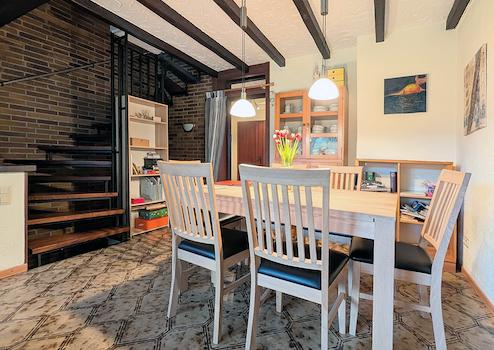 Im Erdgeschoss gelangen Sie über die Diele in die Küche, zum Gäste-WC sowie zum Wohn- und Esszimmer. Der offen gestaltete Wohn- und Essbereich bildet das Herzstück des Hauses. Sichtbare Deckenbalken, ein charaktervoller Fliesenboden und eine offene Holz-Metall-Treppe verleihen dem Raum eine warme und individuelle Atmosphäre. Vom Wohn- und Esszimmer aus haben Sie direkten Zugang zur Terrasse und in den Garten, der zum Entspannen und Verweilen einlädt.
